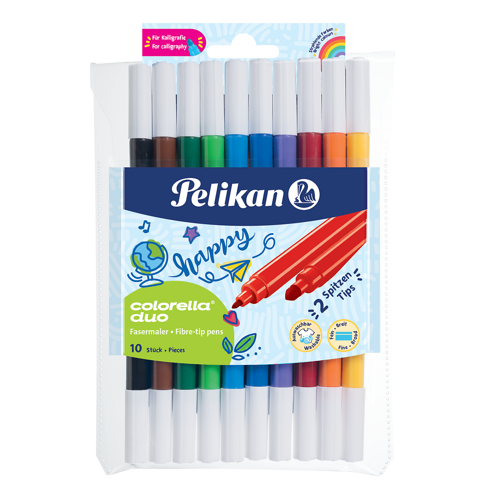 Flamastry Pelikan Colorella Duo C407 to zestaw 10 dwustronnych pisaków w intensywnych kolorach. Jedna końcówka umożliwia precyzyjne rysowanie, a druga tworzenie większych powierzchni. Praktyczne etui-blister ułatwia przechowywanie i transport, co czyni je idealnym narzędziem do szkoły, domu i kreatywnych projektów.