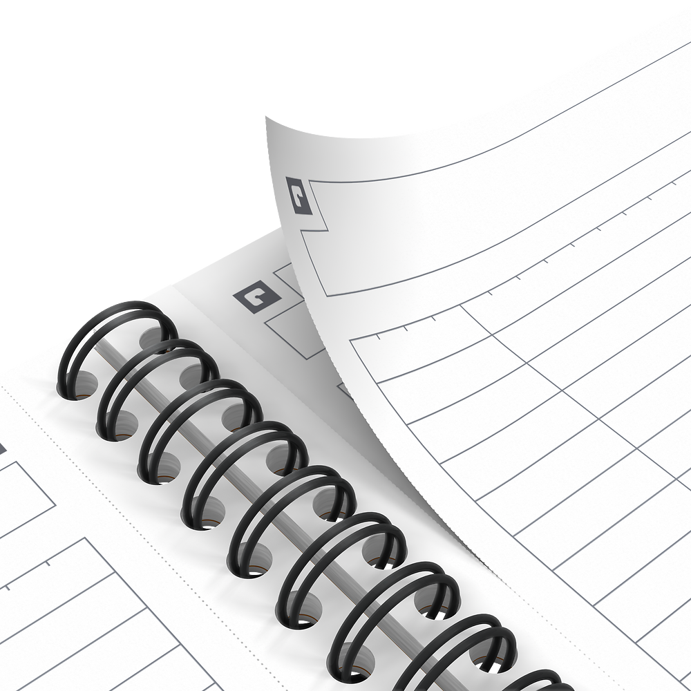 - Podwójna spirala pozwala na otwarcie notatnika na 360°, co ułatwia notowanie w samolocie lub pociągu