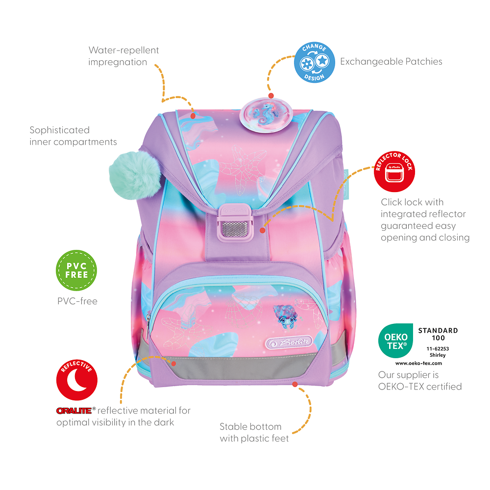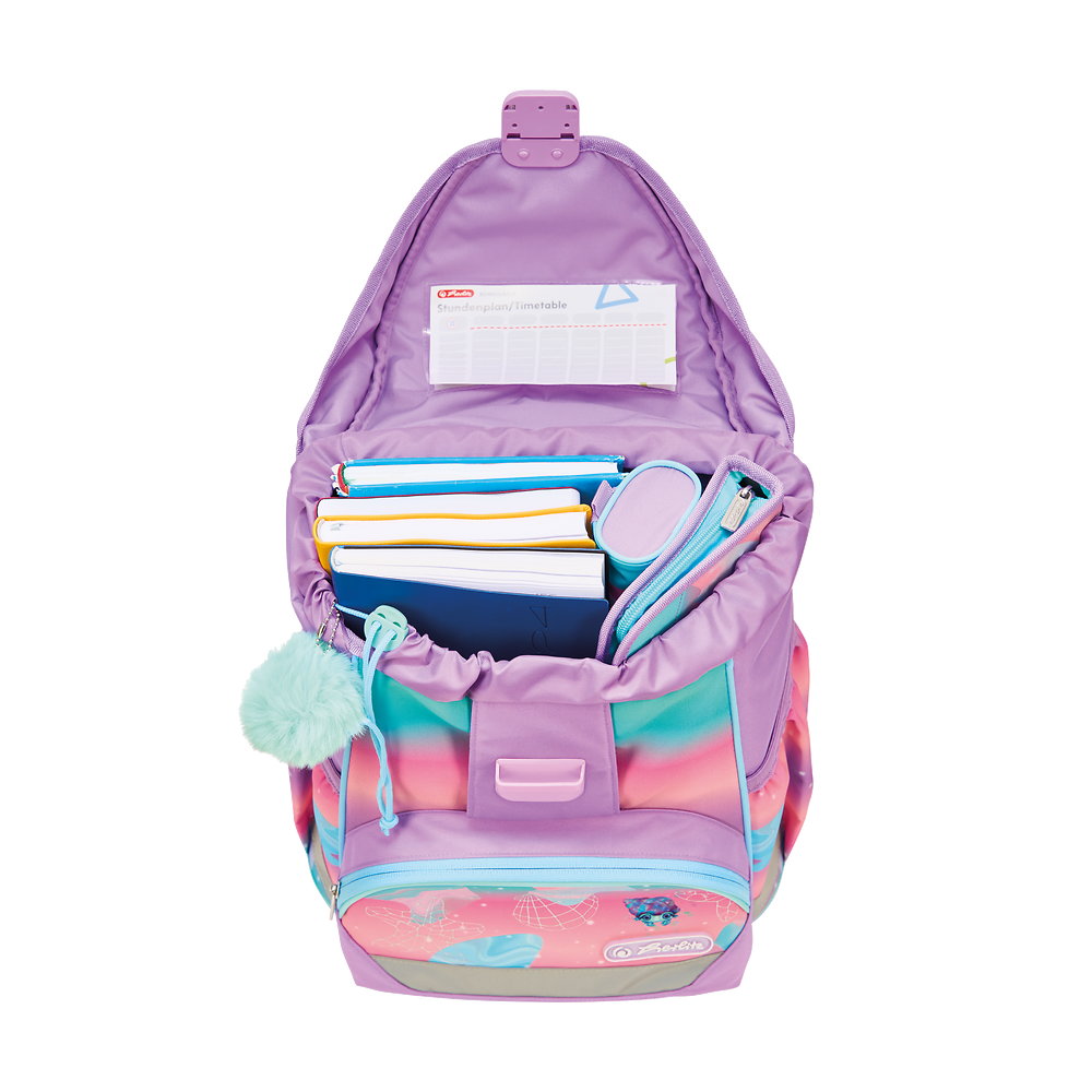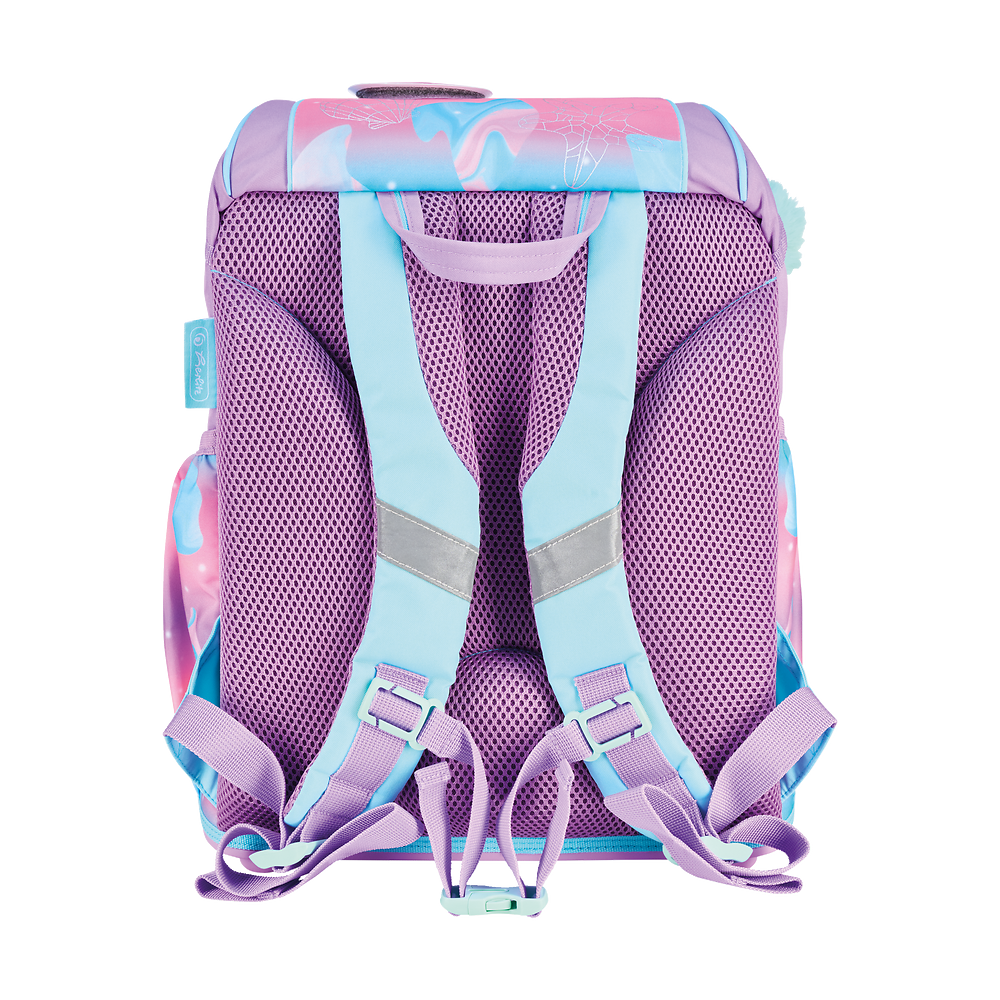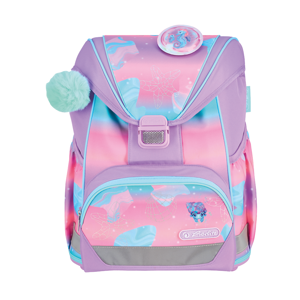 Tornister Herlitz UltraLight to wyjątkowo lekki model. Dzięki miękkiemu korpusowi zamykanemu na ściągany sznurek tornister zapewnia szybką regulację objętości. Waży bardzo niewiele bo niecałe 750-800 gramów. Dzięki ergonomicznie ukształtowanym plecom z regulowanymi szelkami i pasem piersiowym umożliwia dopasowanie wysokości. Model ten zapewnia wysoki komfort noszenia, dostosowując się idealnie do pleców dziecka. Co szczególnie ważne w drodze do szkoły, materiał odblaskowy w przedniej części, po bokach oraz na szelkach i dodatkowy odblask na klamrze zapewniają szybką widoczność na drodze. Wiele radości dają dwie wymienne aplikacje na klapę, które dziecko może wymienić, kiedy tylko zechce.