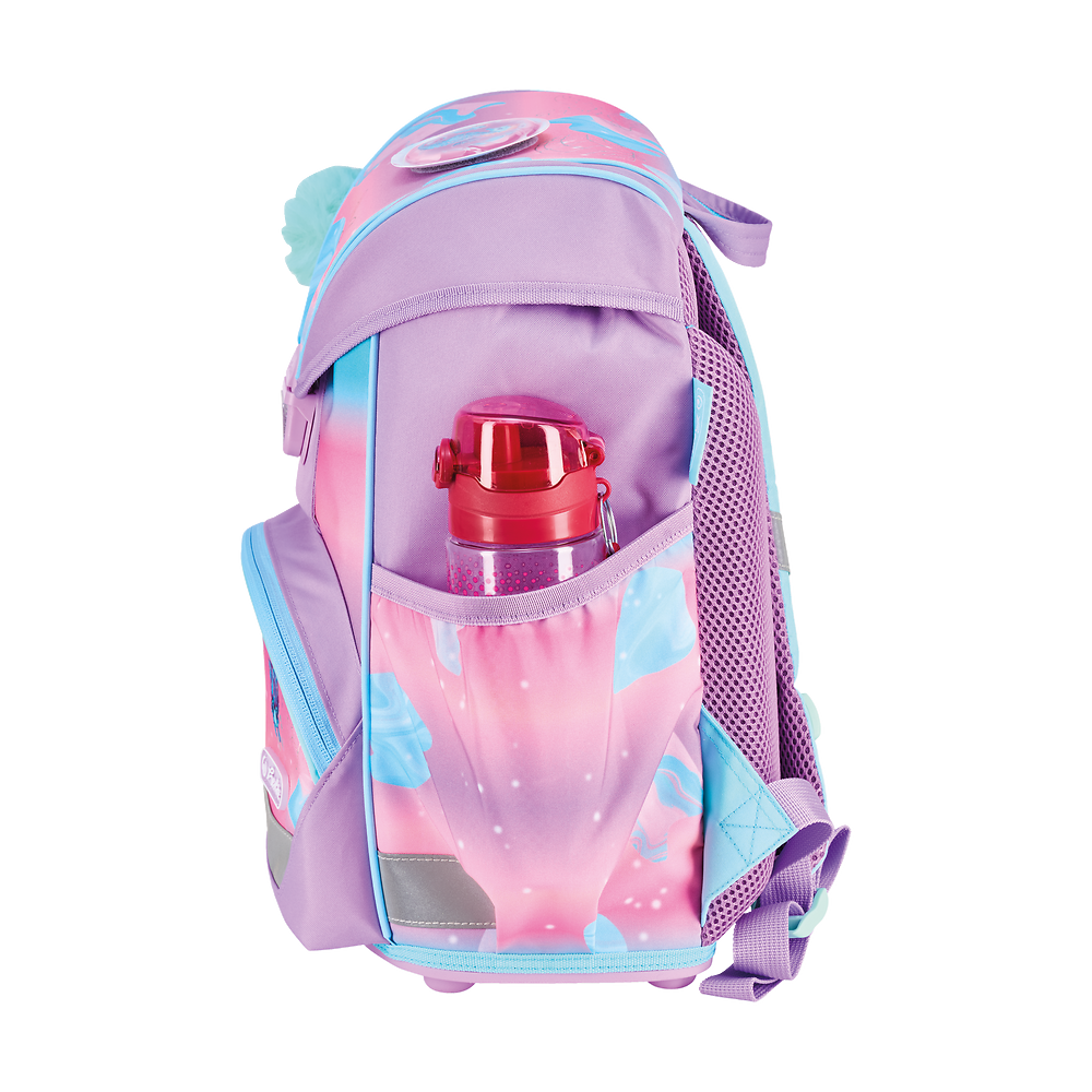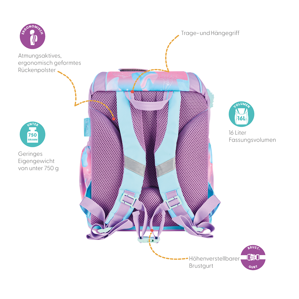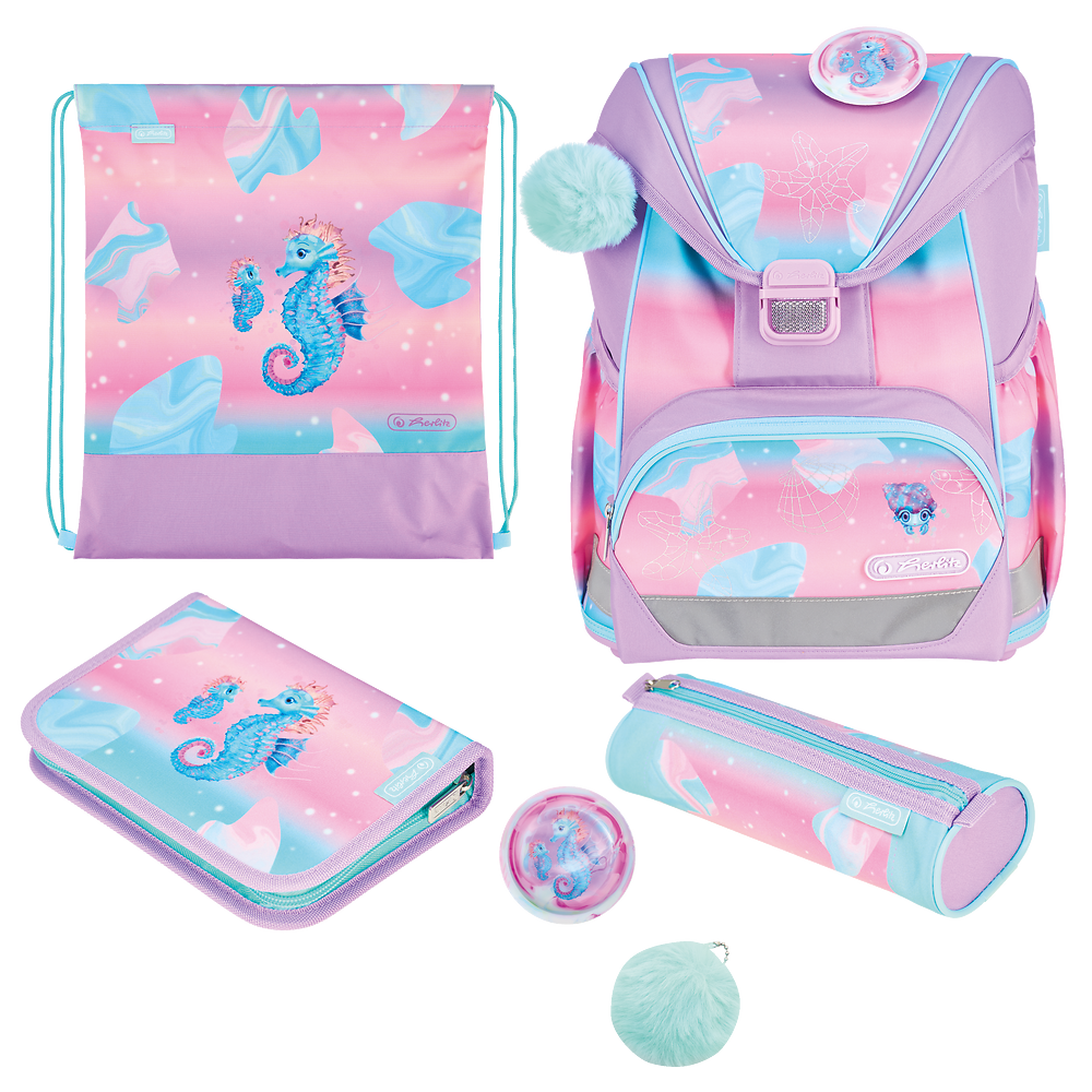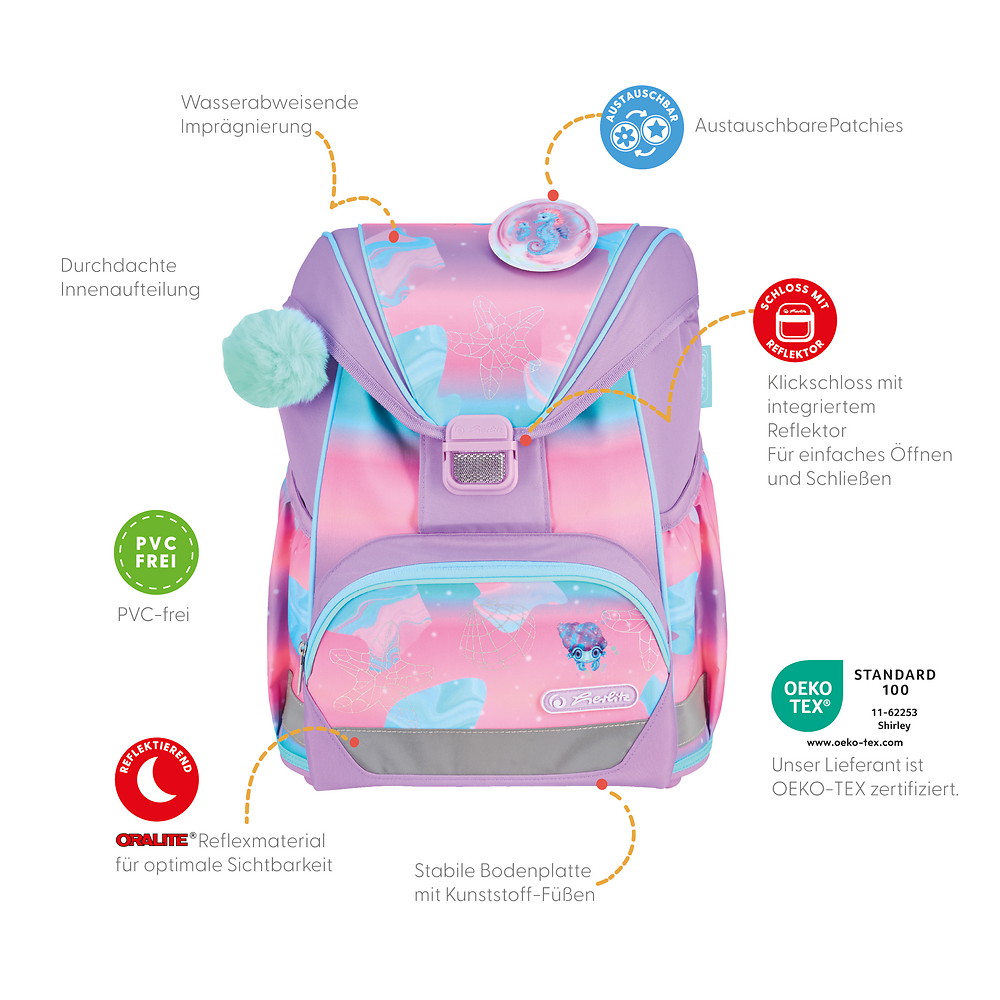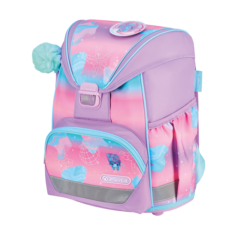 Tornister Herlitz UltraLight to wyjątkowo lekki model. Dzięki miękkiemu korpusowi zamykanemu na ściągany sznurek tornister zapewnia szybką regulację objętości. Waży bardzo niewiele bo niecałe 750-800 gramów. Dzięki ergonomicznie ukształtowanym plecom z regulowanymi szelkami i pasem piersiowym umożliwia dopasowanie wysokości. Model ten zapewnia wysoki komfort noszenia, dostosowując się idealnie do pleców dziecka. Co szczególnie ważne w drodze do szkoły, materiał odblaskowy w przedniej części, po bokach oraz na szelkach i dodatkowy odblask na klamrze zapewniają szybką widoczność na drodze. Wiele radości dają dwie wymienne aplikacje na klapę, które dziecko może wymienić, kiedy tylko zechce.