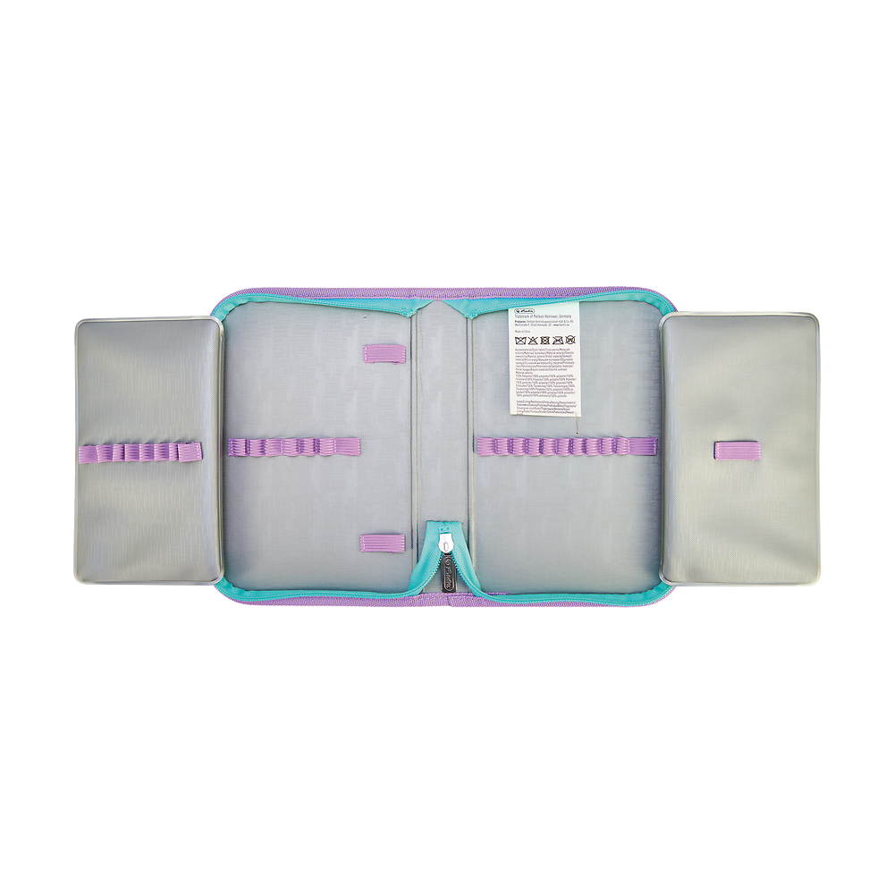 - 1 duża komora z osobną przegrodą na książki, 2 boczne kieszenie z elastycznymi paskami, 1 przednia kieszeń zapinana na zamek