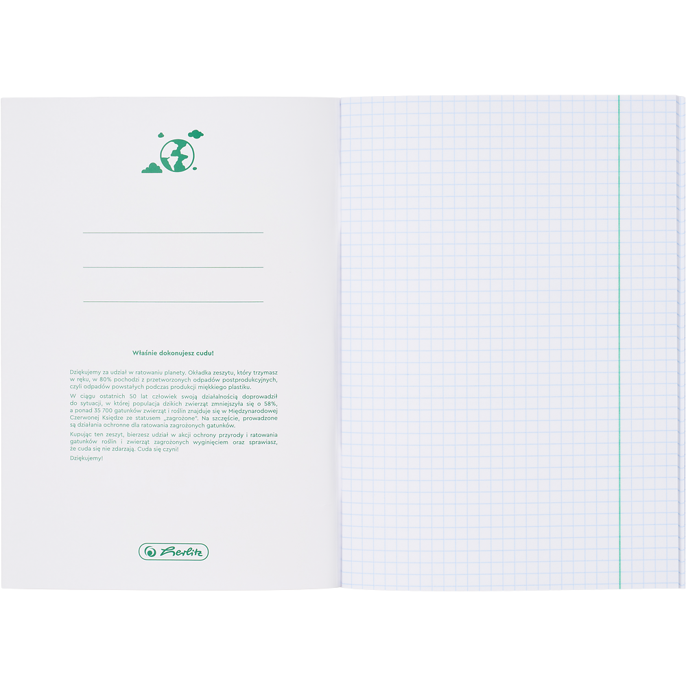 Zeszyty przedmiotowe Herlitz Eco PP to idealne rozwiązanie dla uczniów, którzy chcą łączyć funkcjonalność z dbałością o środowisko. Ich wyjątkowa konstrukcja opiera się na dwuwarstwowej okładce – zewnętrznej, wykonanej z mlecznego polipropylenu, oraz wewnętrznej, z zadrukowaną grafiką przedmiotową. Co ważne, aż 30% materiału pochodzi z przetworzonych odpadów pokonsumenckich, takich jak sieci rybackie, liny i włókna morskie wyłowione z oceanów. Okładka jest wodoodporna i trwała, dzięki czemu nie wymaga dodatkowych osłon – skutecznie chroni zawartość zeszytu nawet przy intensywnym użytkowaniu. Niebieska liniatura z zielonym marginesem doskonale wpisuje się w ekologiczny styl kolekcji, a na stronie tytułowej znajduje się adresówka do podpisania, natomiast wewnątrz – ściągi z wybranego przedmiotu.