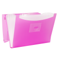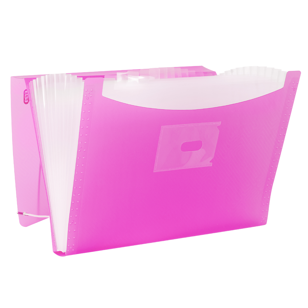 Teczka harmonijkowa na dokumenty, wykonana z przezroczystego polipropylenu w różowym, energetyzującym kolorze. 13 przegródek umożliwia segregację dokumentów na kilka kategorii, co pomaga zachować porządek. Na grzbiecie teczki znajduje się etykieta opisowa dla łatwiejszej identyfikacji zawartości. Narożne gumki zamykające chronią zawartość teczki.