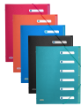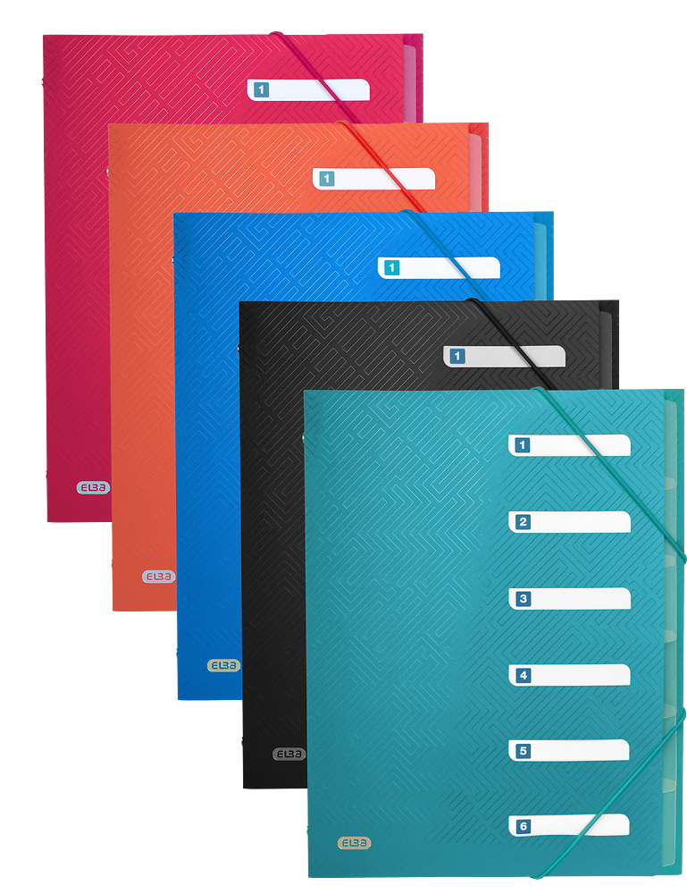 Teczki segregujące na dokumenty, wykonane z nieprzezroczystego polipropylenu w pięciu różnych, nasyconych kolorach. W środku znajduje się 6 przekładek do segregowania dokumentów oraz papierowe indeksy do opisu zawartości. Narożne gumki zamykające chronią wnętrze teczek.